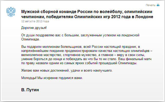 Поздравление В.В.Путина волейболистам (скрин с сайта Президента РФ):